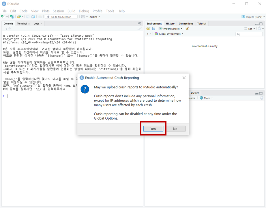첫 화면 팝업 Enable Automated Crash Reporting 은 R Studio 충돌 날 경우 보고서를 보낼지 묻는 것이다.