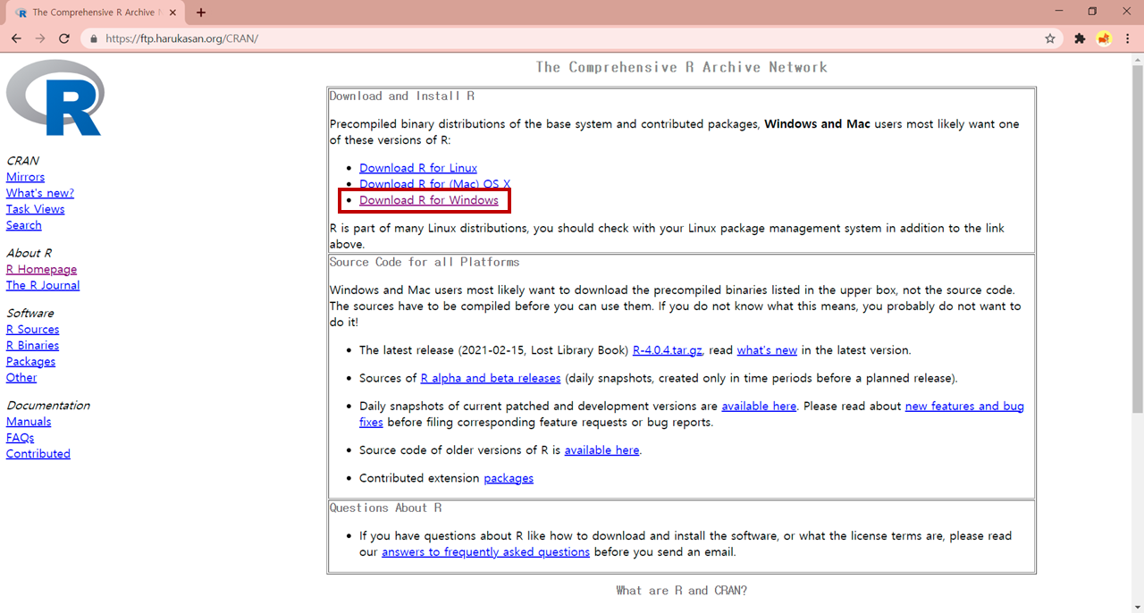 5. Download R X.0.X for Windows 클릭