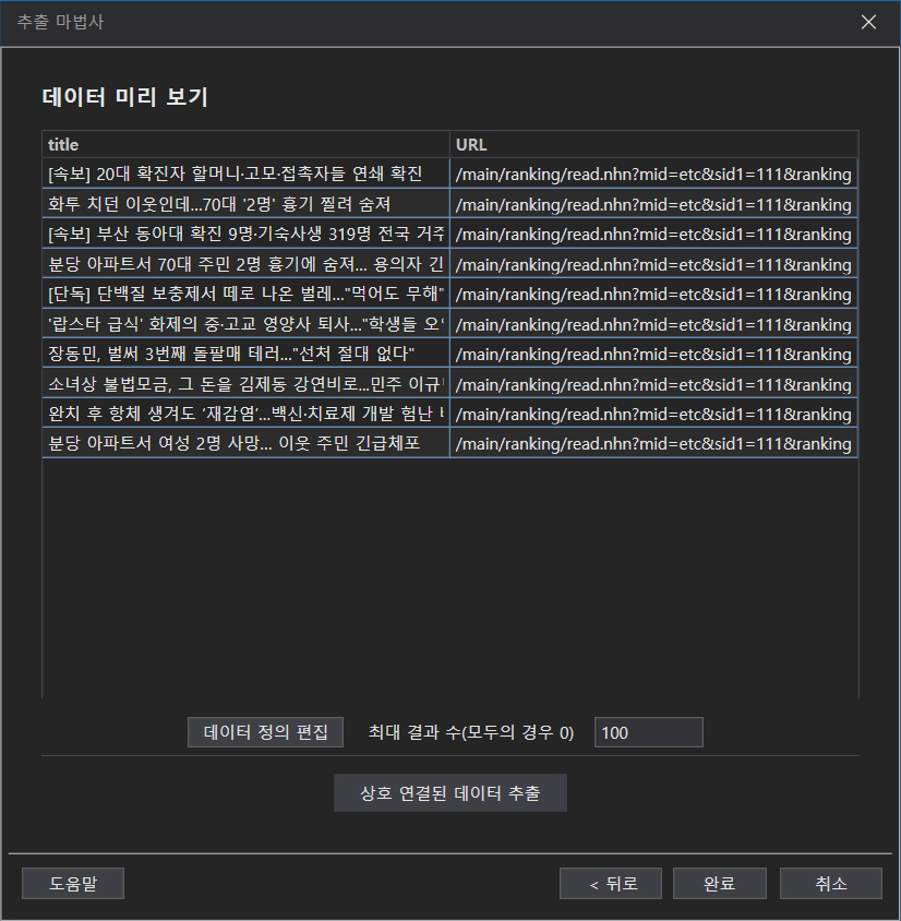 7. 그럼 규칙성을 이해한 프로그램이 기사 제목만 전체 선택하게 됩니다.