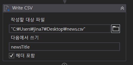 원하는 경로를 선택하고 아까 반환 값이 저장된 newsTitle이라는 데이터 테이블 형태의 변수 이름을 넣어줍니다.