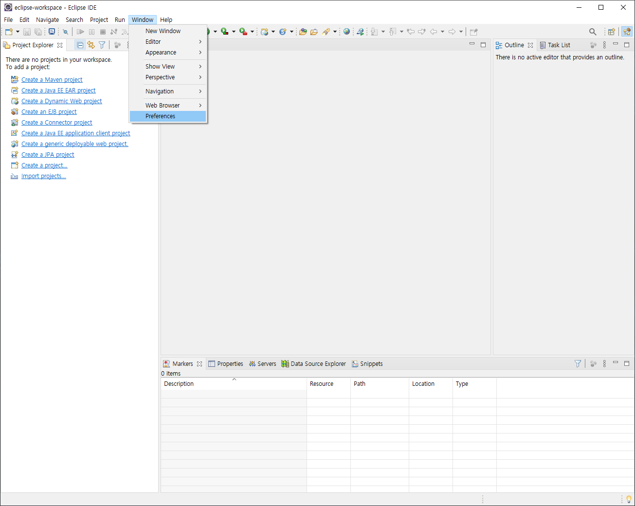 이클립스를 실행하고 상단의 Windows → Preference 를 클릭합니다.