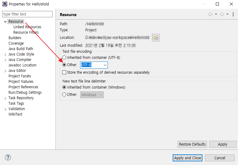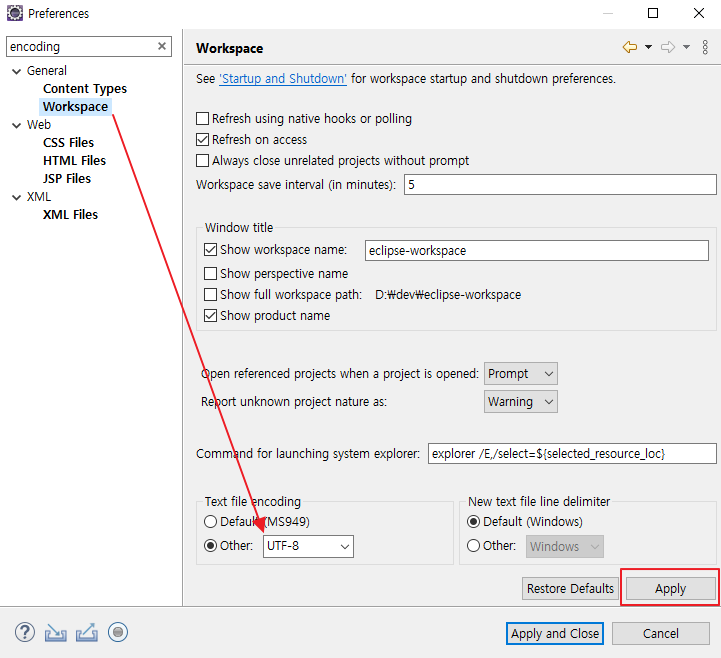 두 번째로 Workspace 를 선택하고 Other UTF-8로 변경하고 Apply(적용)을 클릭합니다.