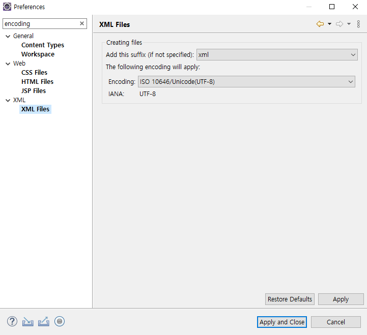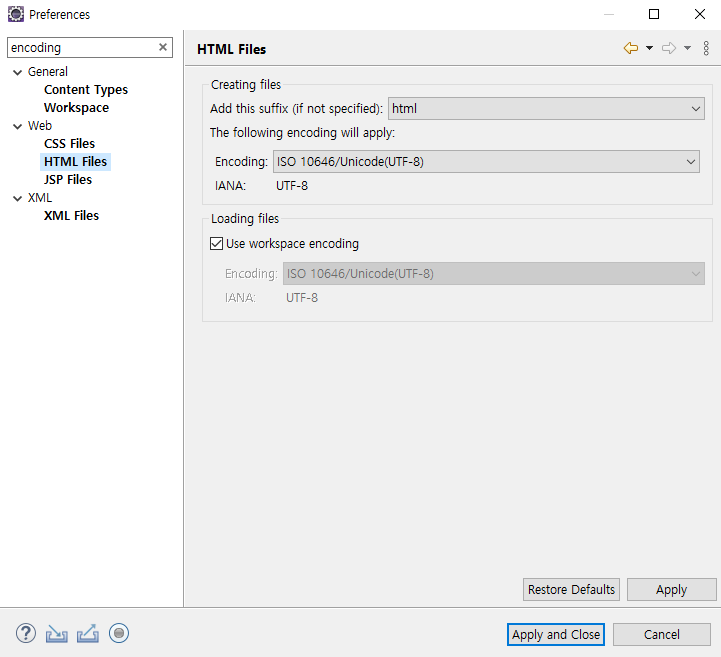 HTML Files, JSP Files, XML Files 에서 UTF-8ISO 10646/Unicode(UTF-8)으로 변경