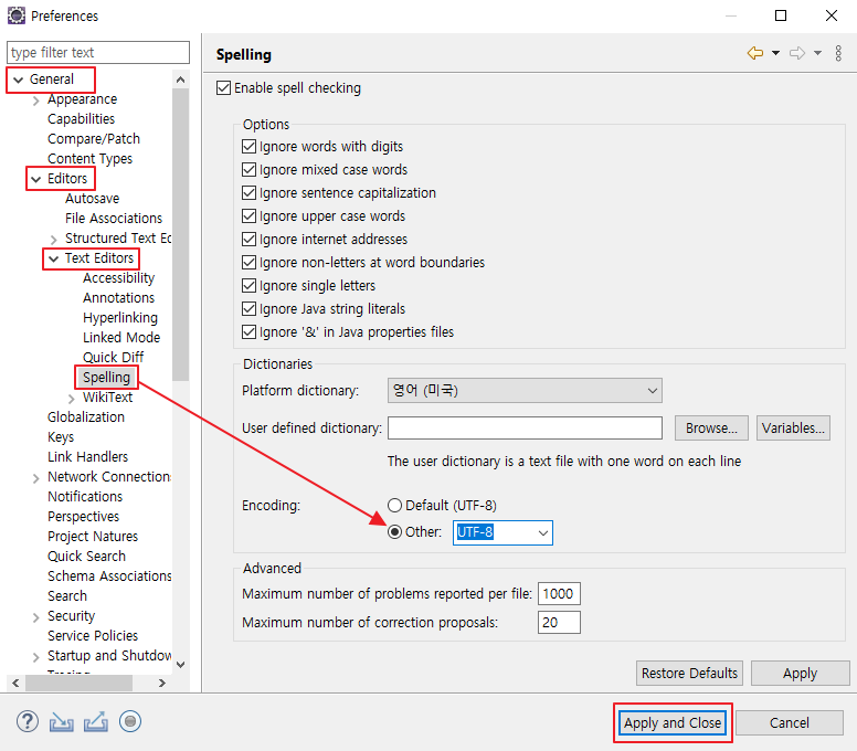마지막으로 General → Editors → Text Editors → Spelling을 선택해서 Other UTF-8로 변경한 후 Apply and Close 를 클릭해서 적용 완료 합니다.