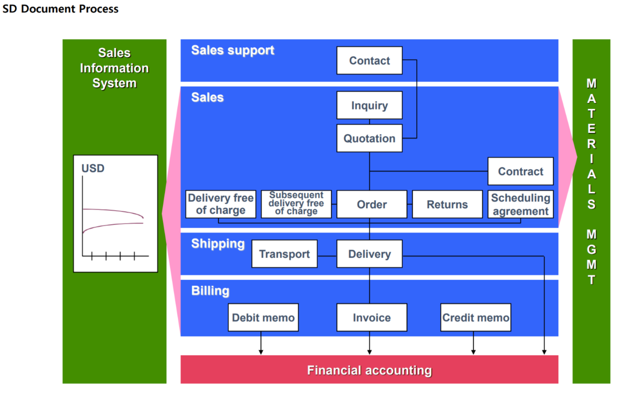 SD는 Sales & Distribution의 약자이며 영업과 유통, 판매, 대금청구 등의 영업활동을 관리 하는 모듈이다.
