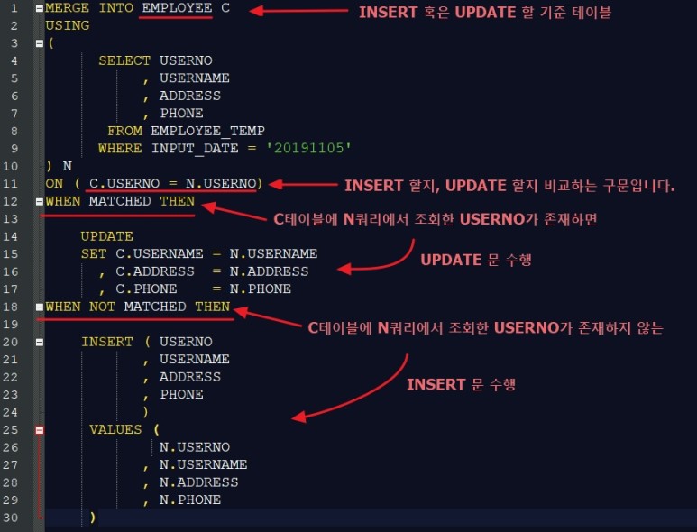 MERGE 구문은 시스템에서 INSERT, UPDATE 를 한번에 사용하게 해주는 구문이며,